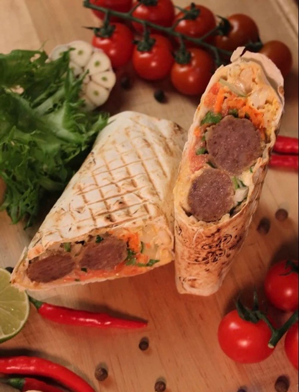 Лаваш, соус сливочный, пекинская капуста, огурцы, помидоры, морковь по-корейски, говяжий кебаб