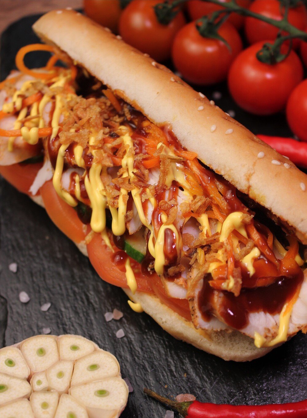 булка для хот-дога, соус сливочный, соус томатный, курица, морковь по-корейски, помидоры, огурцы