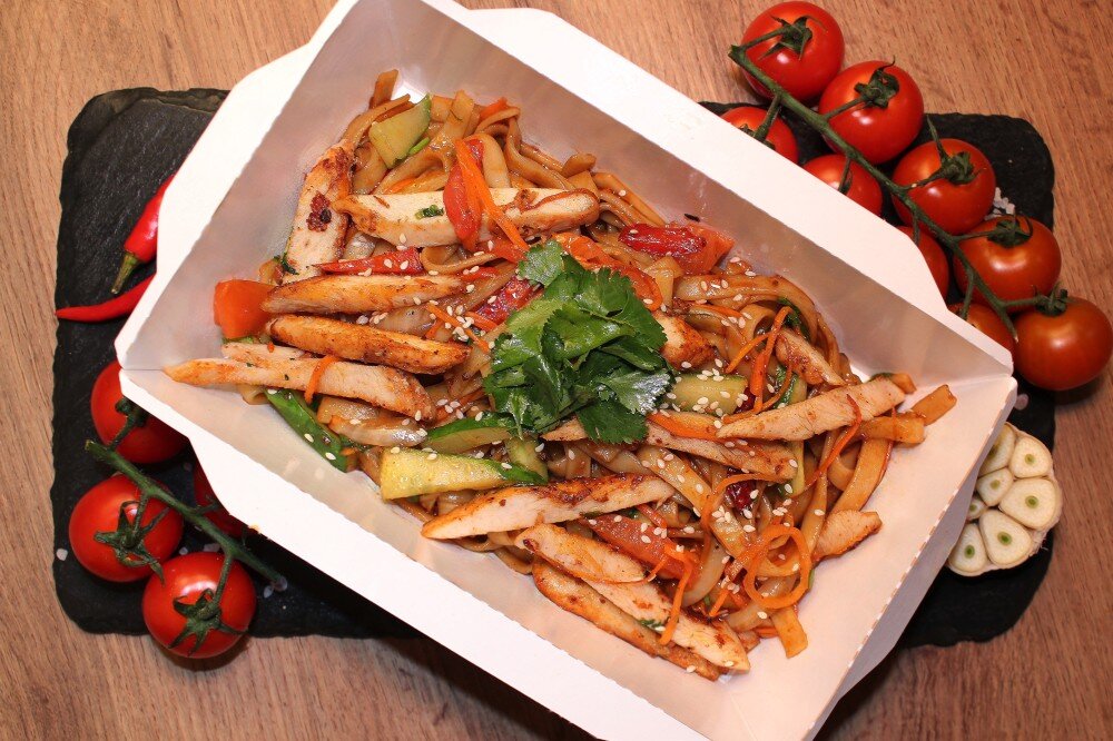 лапша удон, курица, морковь по-корейски, болгарский перец, пекинская капуста, огурцы, помидоры, соус вок, кунжут