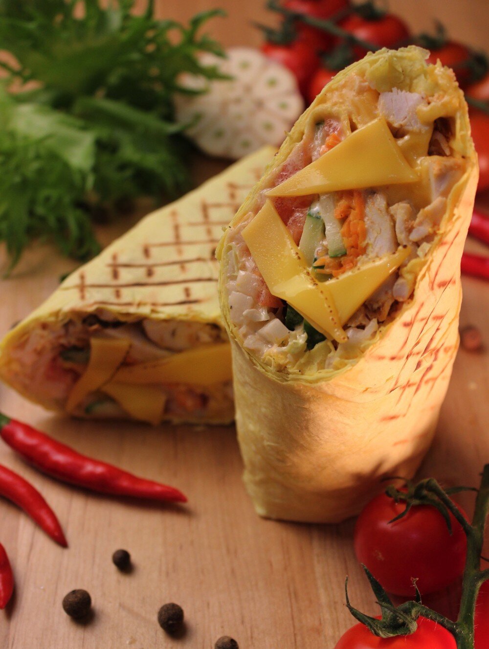 лаваш сырный, соус сливочный, пекинская капуста, огурцы, томаты, сыр, морковь по-корейски, курица