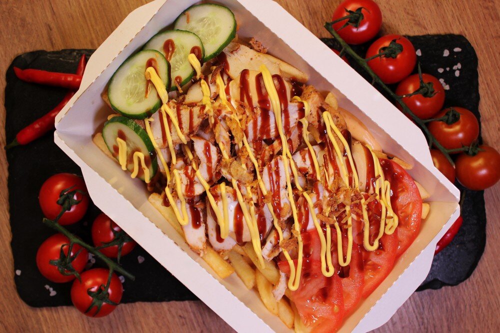 Картофель фри, курица, соус сливочный, соус томатный, огурцы, томаты